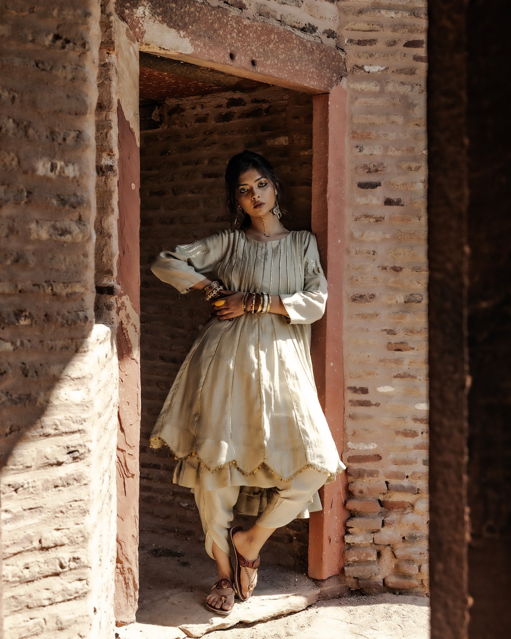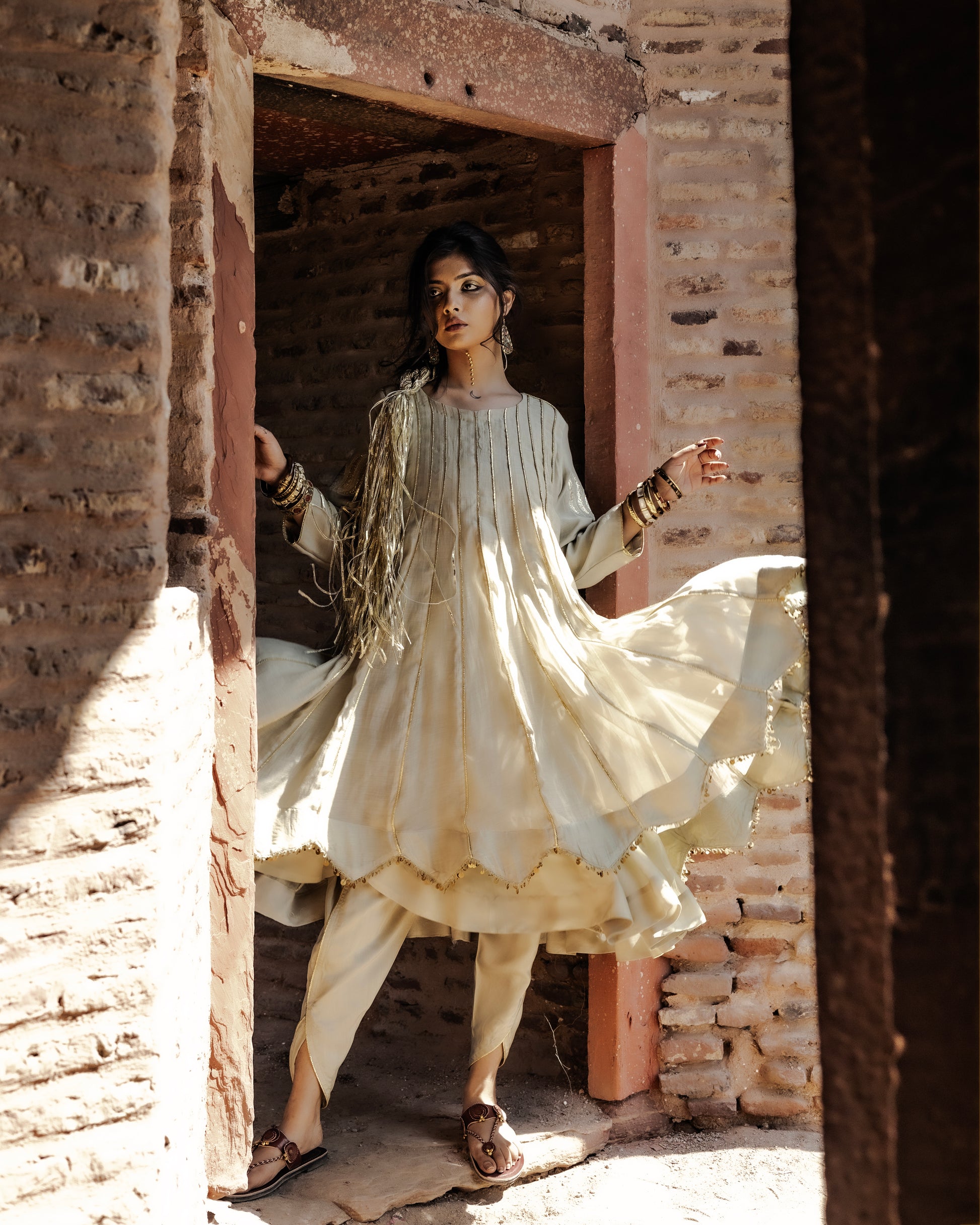 Expertly crafted from pure mull chanderi fabric, this sage green Adaa suit exudes elegance. The short anarkali design is accentuated by kamal design patchwork in gota, while the dhoti and organza dupatta add a touch of finesse. Perfect for special occasions, this suit boasts intricate gota embellishments for a timeless look.
