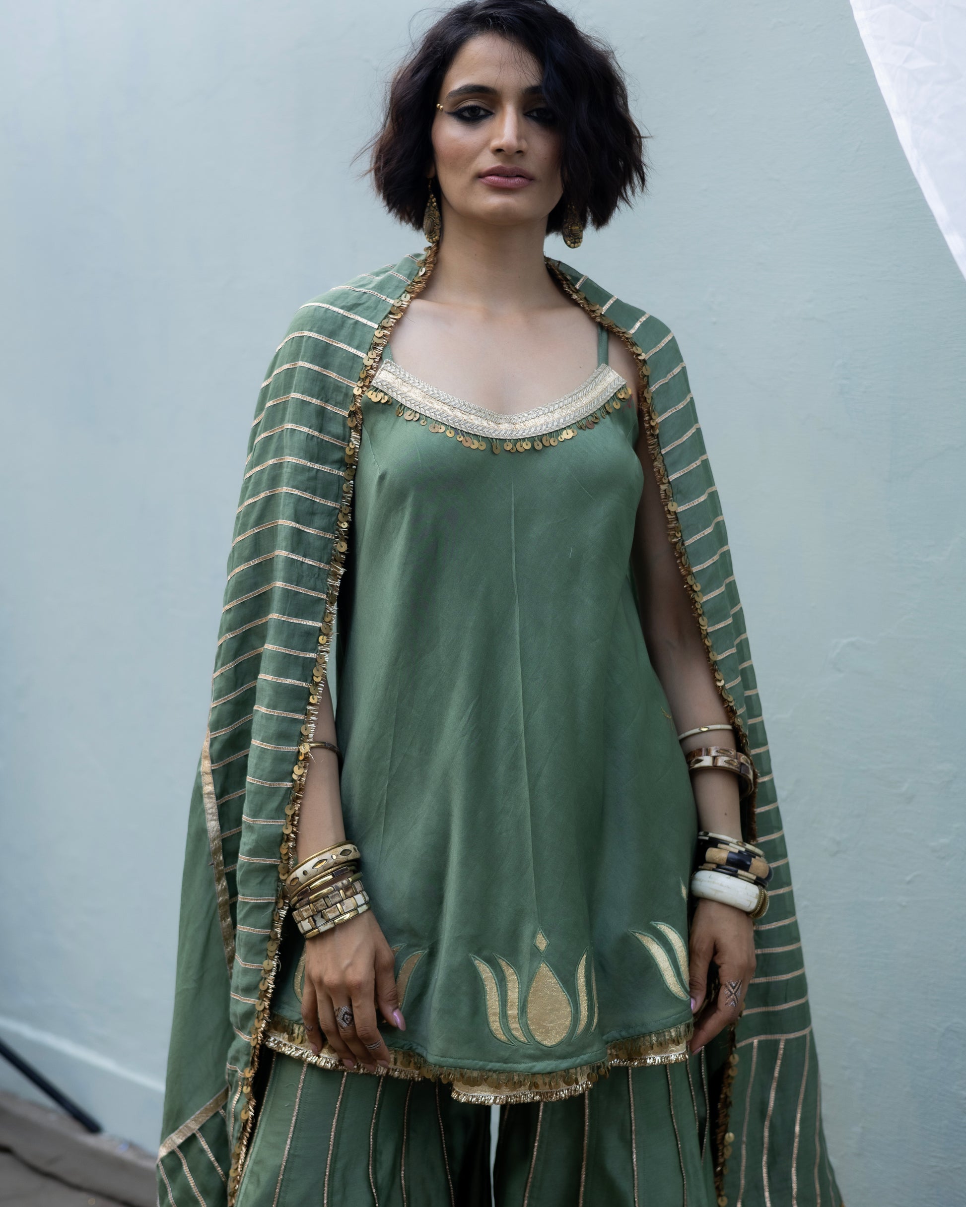 Expertly crafted in CHANDERI, the Ayatoutfit features a KURTA, GARARA, and DUPATTA adorned with elegant GOTA EMBELLISHMENTS. The intricate GOTA PATCH WORK on the KURTA BOTTOM and DUPATTA adds a touch of grace. Perfect for any special occasion