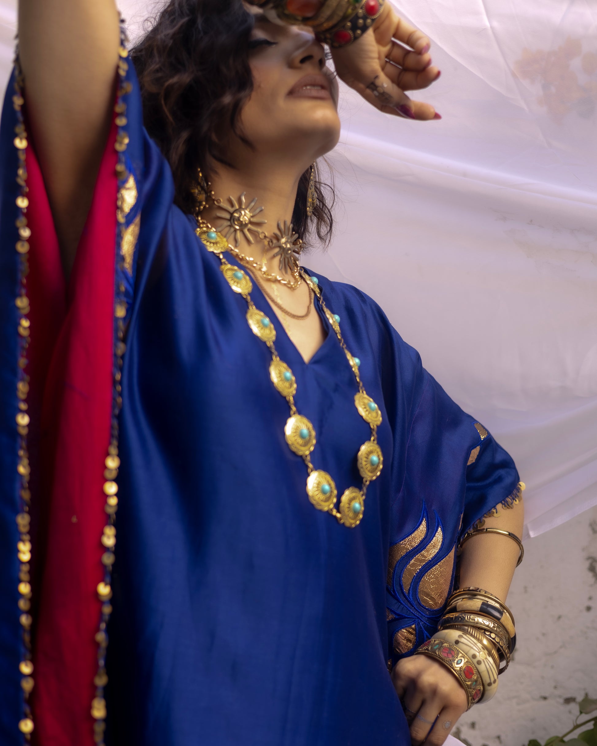 Elevate your style with a stunning ensemble featuring a CHANDERI KAFTA adorned with delicate GOTA PATCHWORK.Make a statement with this timeless and elegant outfit.