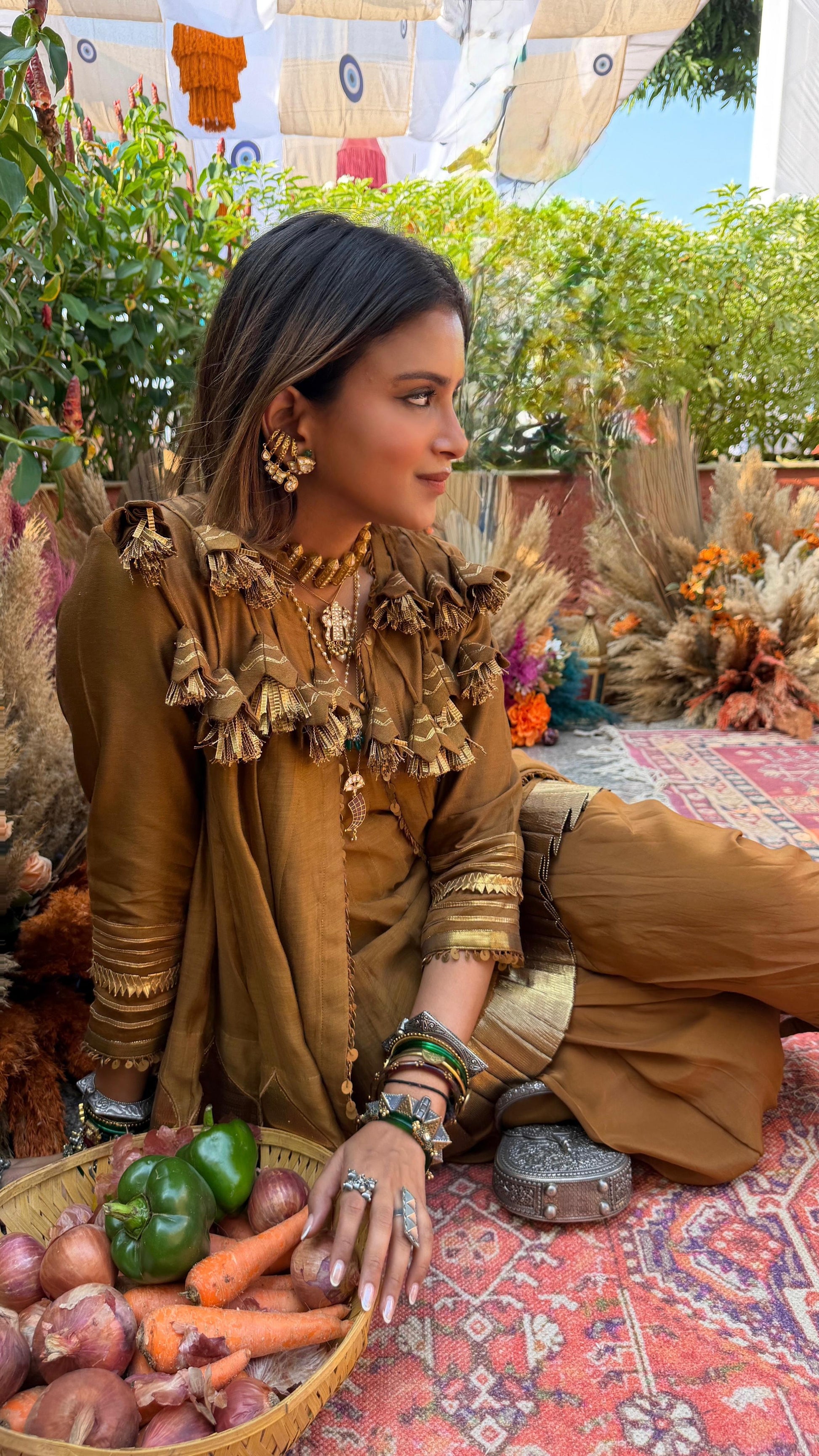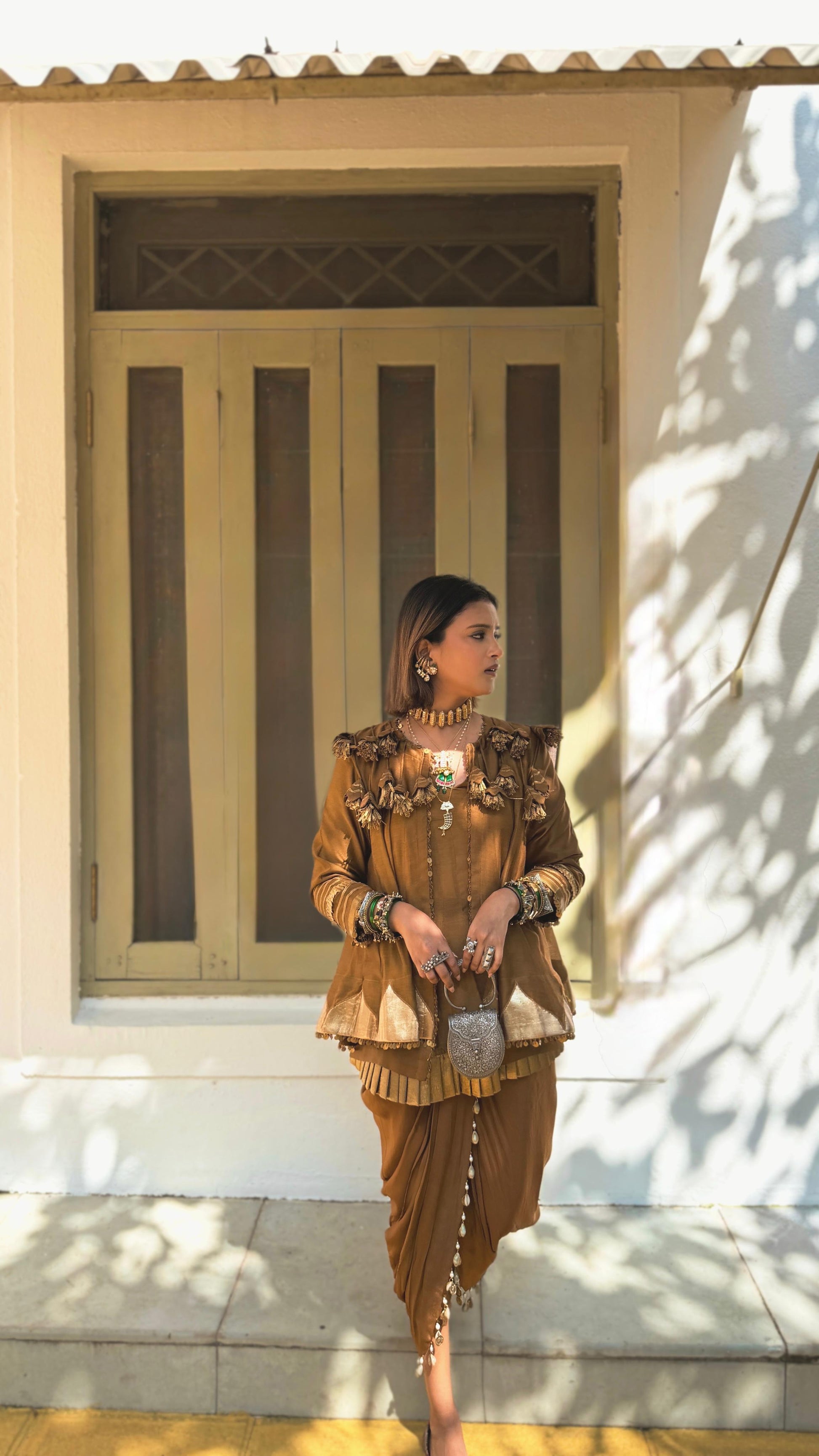 Elevate your style with a stunning ensemble featuring a MAL CHANDERI KURTA adorned with delicate GOTA PATCHWORK, a statement Chanderi Jacket embellished with Gota. Completing the look with Crepe Dhotis with a stylish touch. Make a statement with this timeless and elegant outfit.