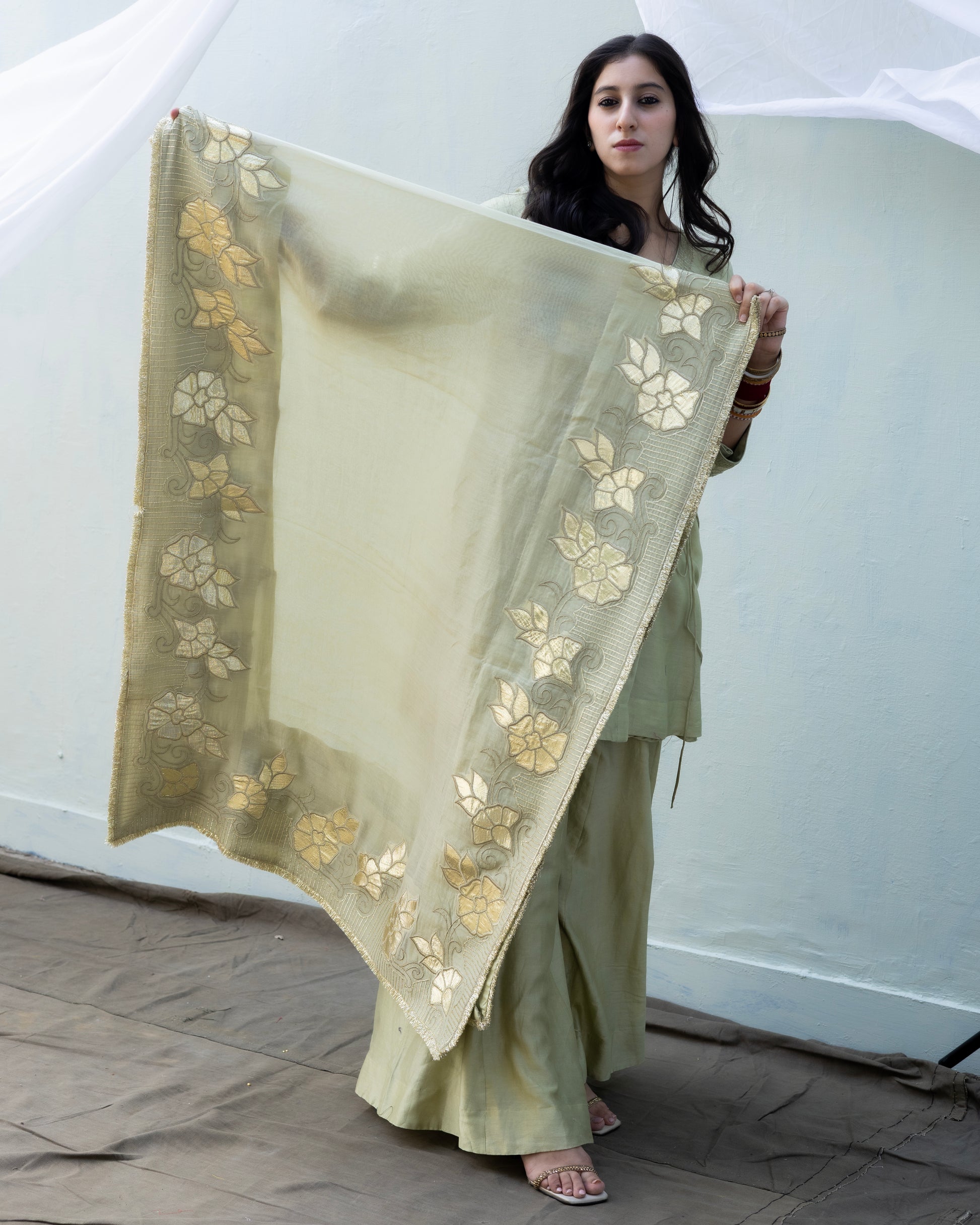 This is an Angrakha Set with Gota Patchwork on the Kurta and all around the border of the Beautiful and Heavy Dupatta. This Comes with bottoms and is a match for most of your occasions