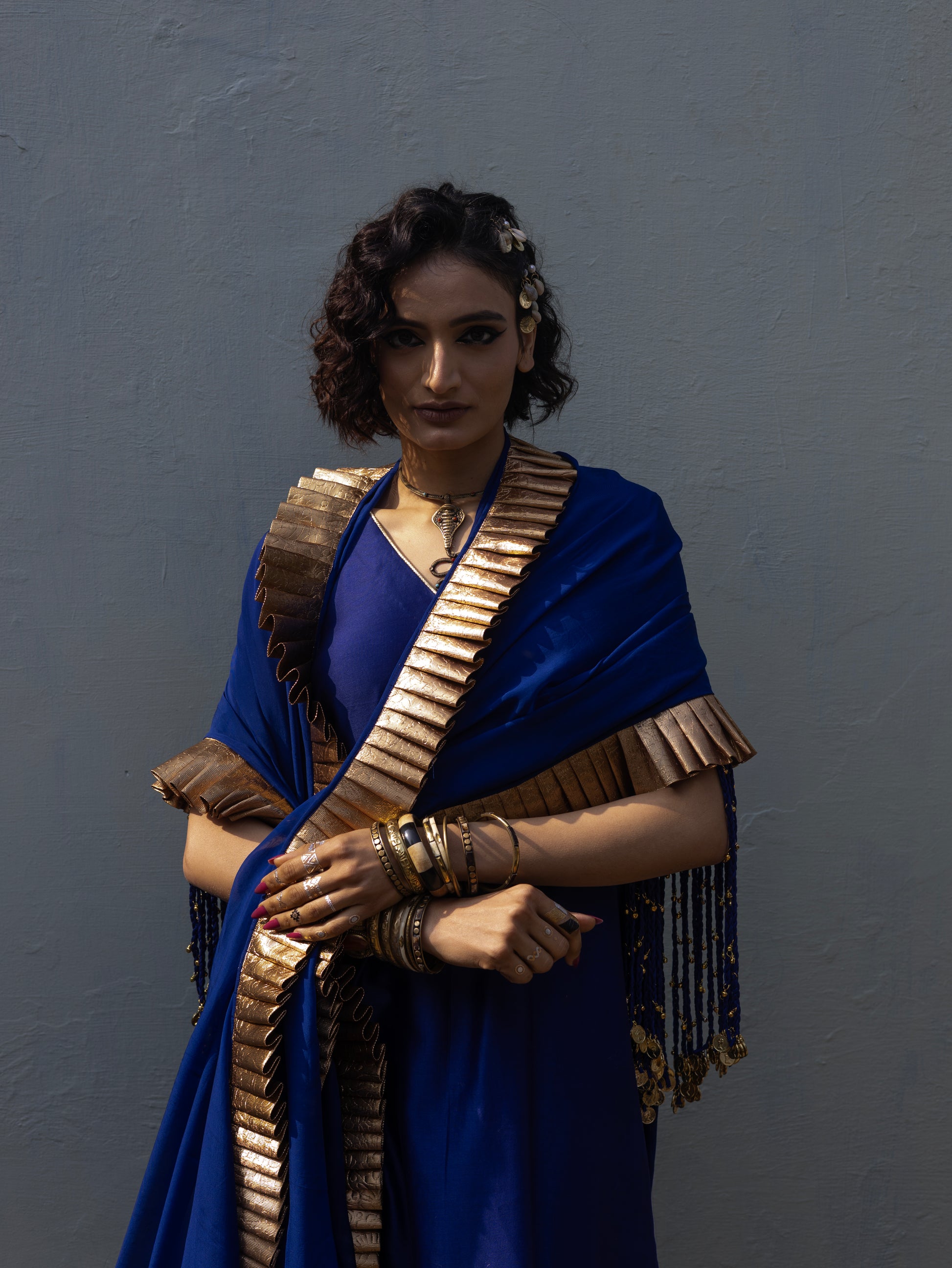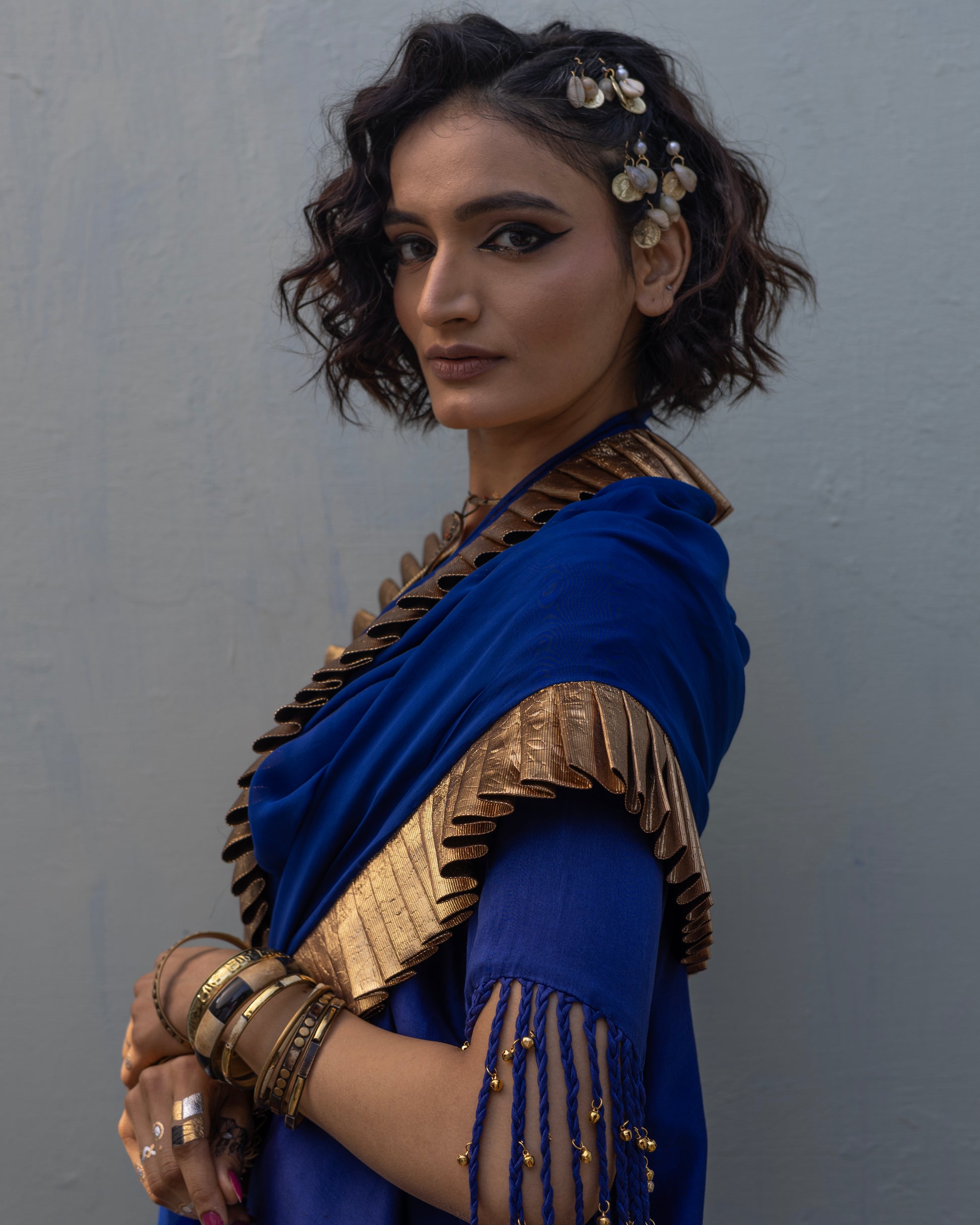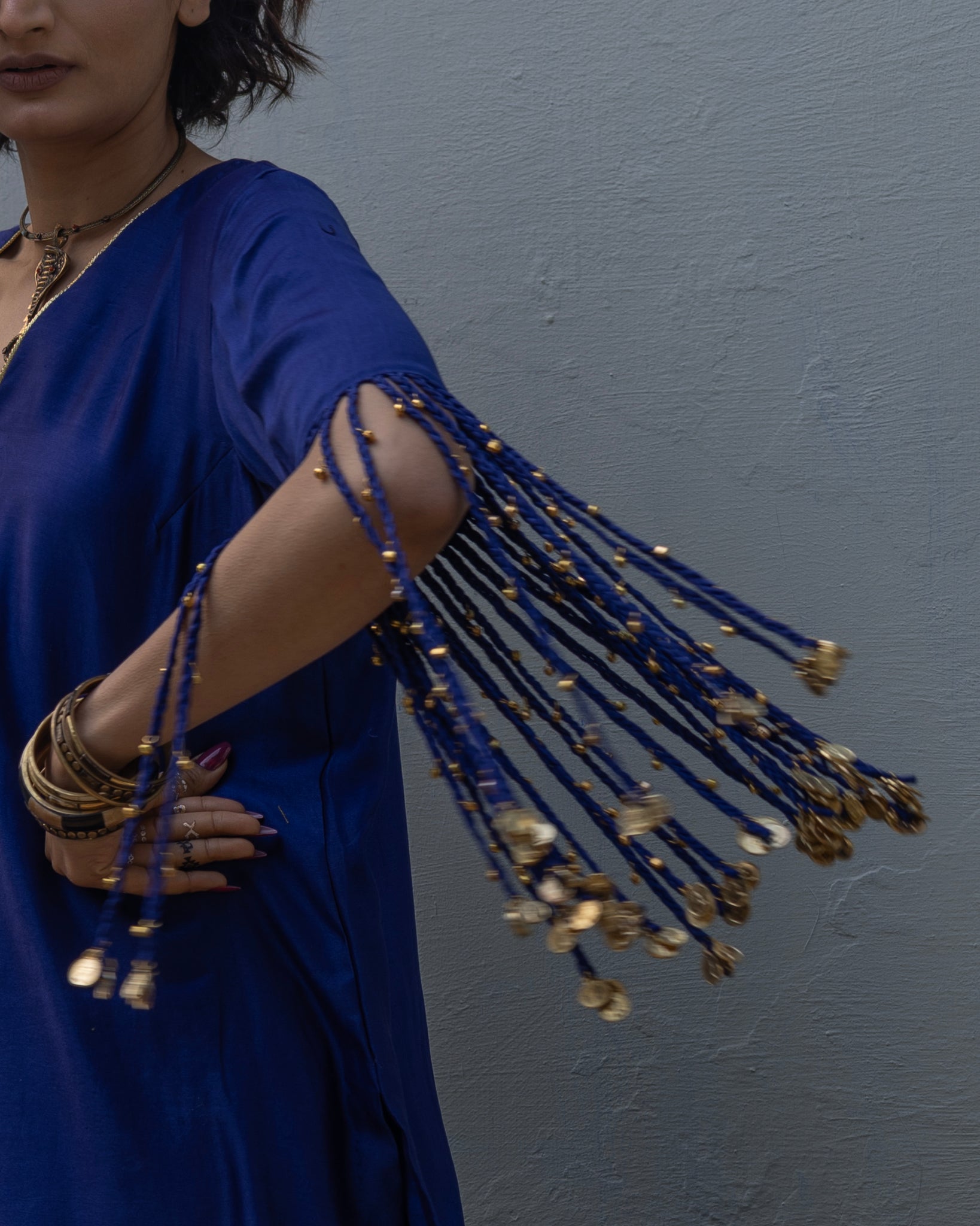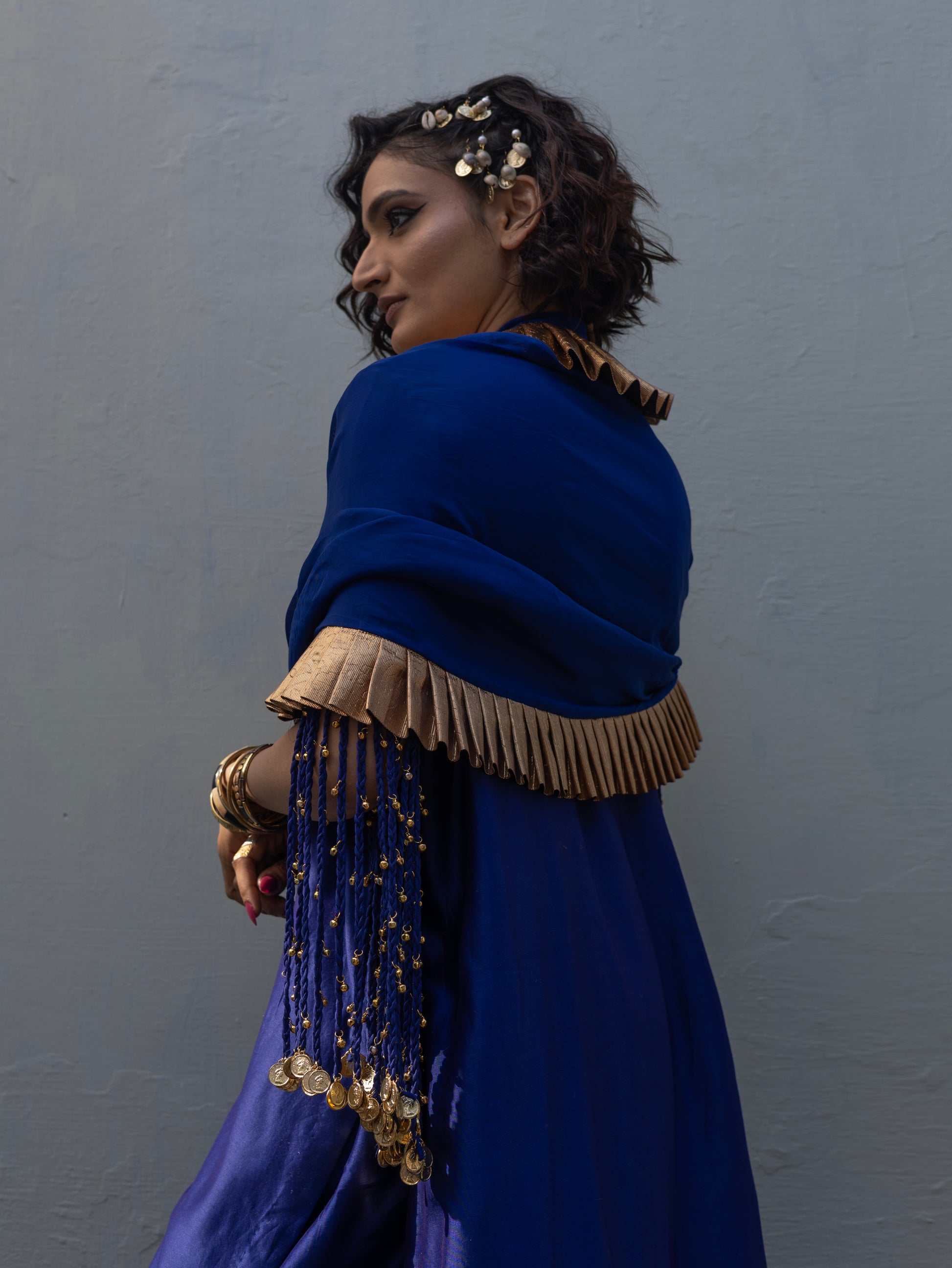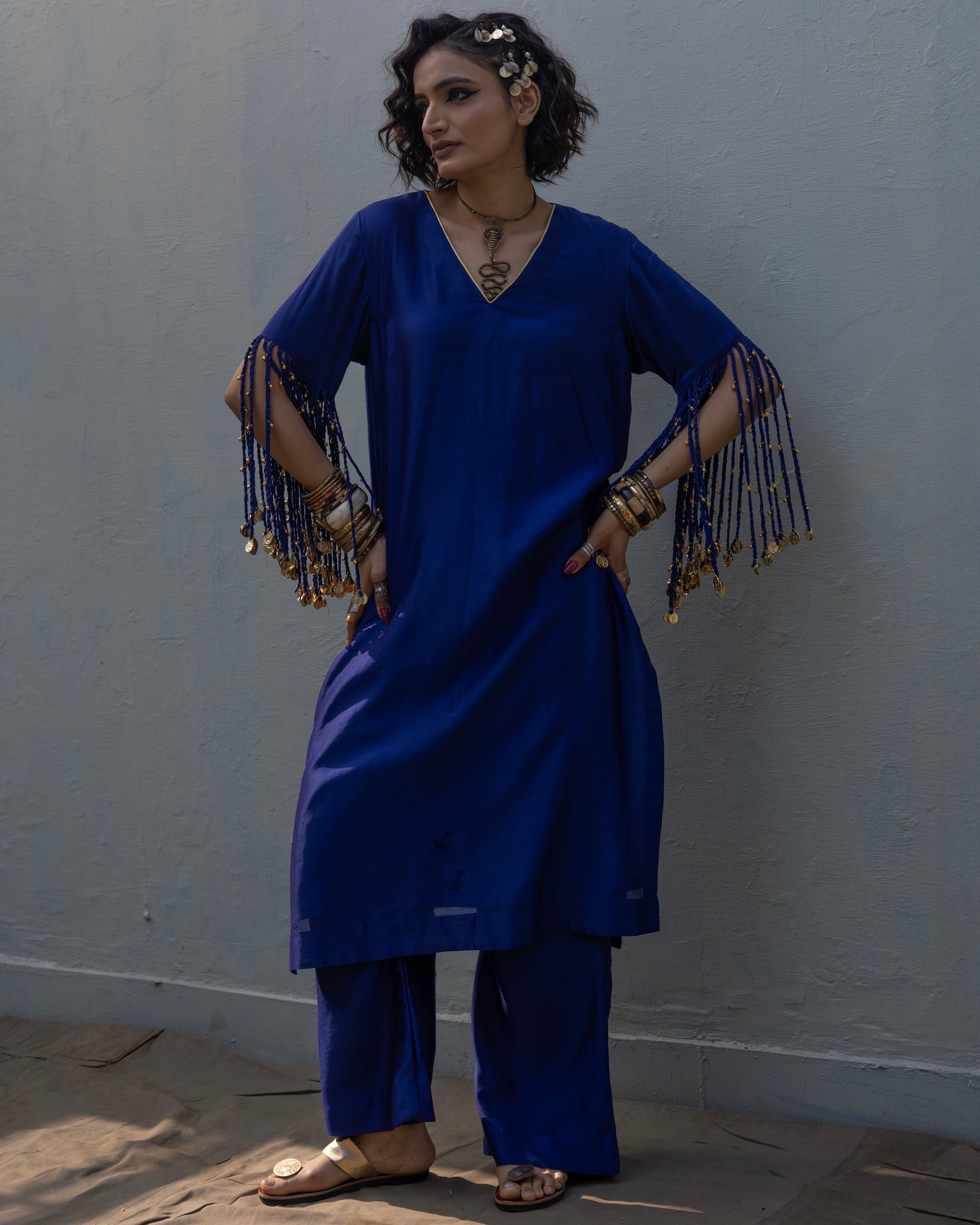 Elevate your style with a stunning ensemble featuring a CHANDERI Kurta adorned with delicate tassles . An Organza Dupatta with Pleated Gota and a Chanderi Pant. Make a statement with this timeless and elegant outfit.