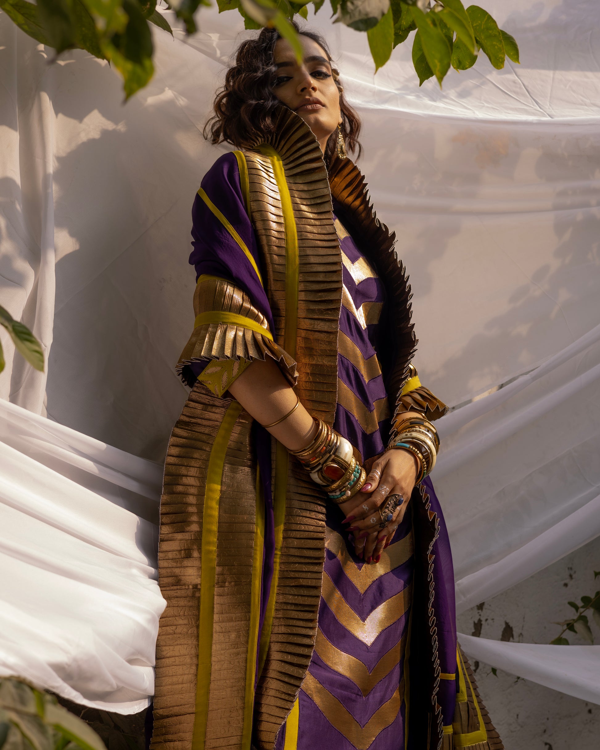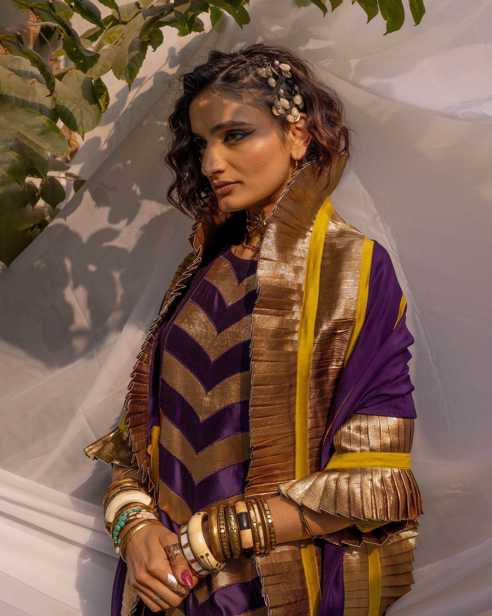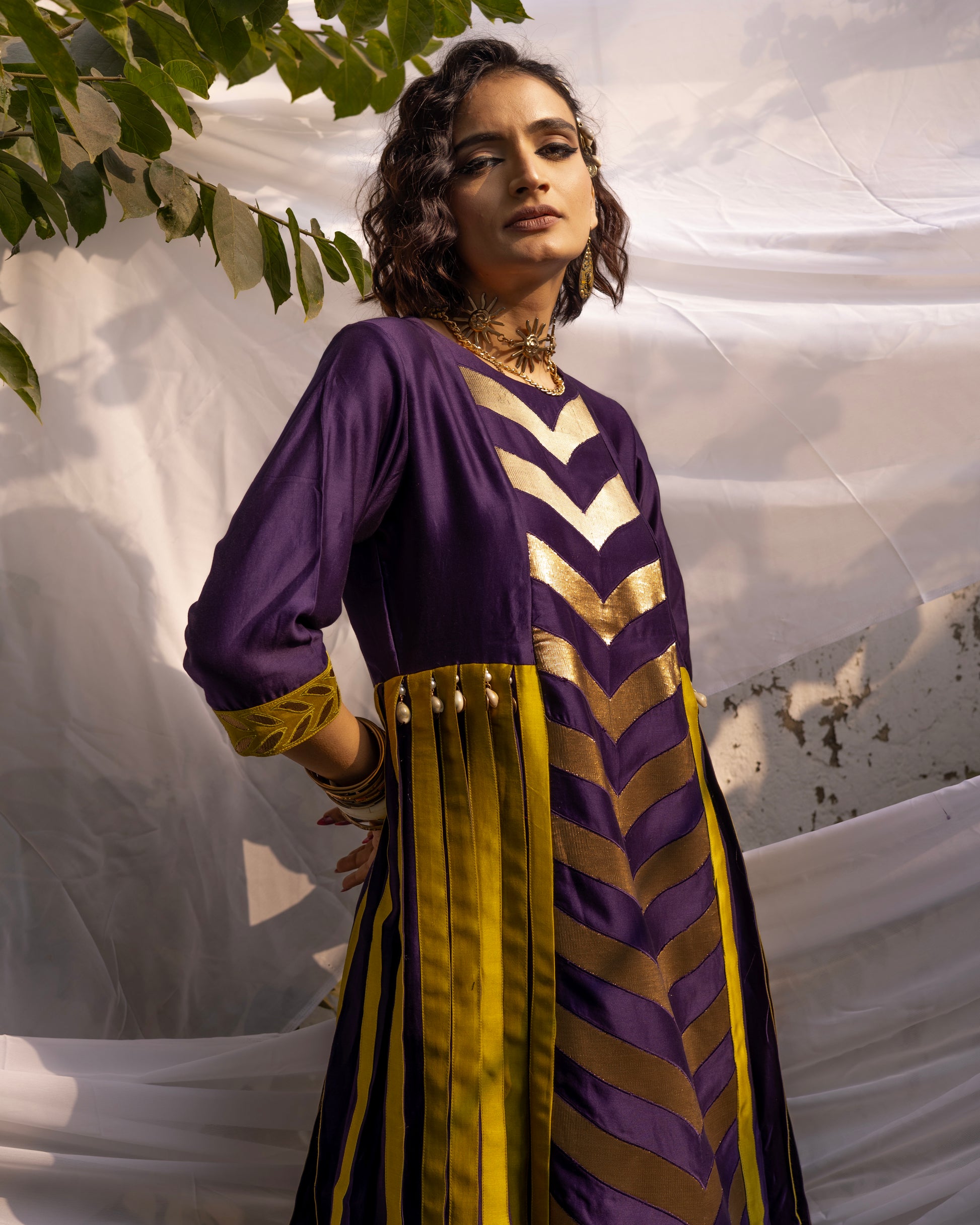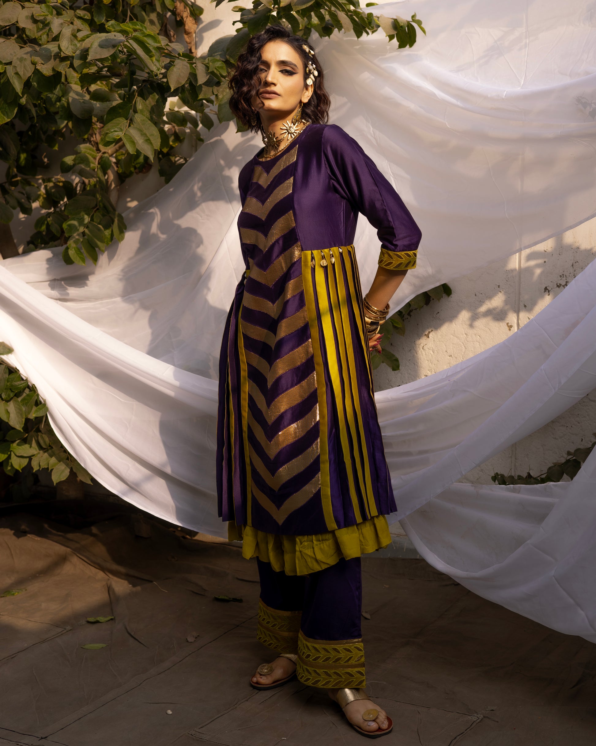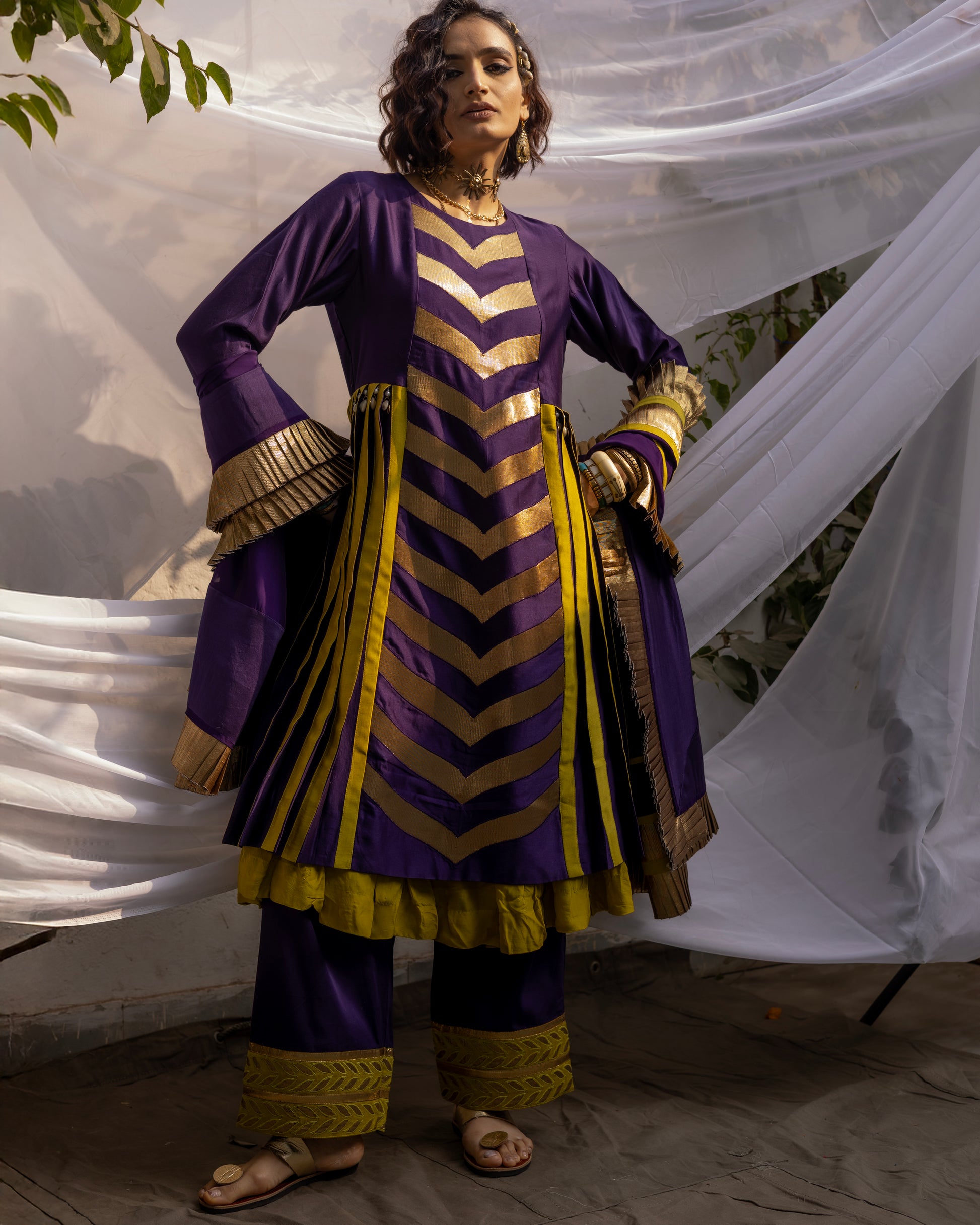 Elevate your style with a stunning ensemble featuring a CHANDERI KURTA adorned with delicate GOTA PATCHWORK, a statement Organza DUPATTA embellished with PLEATED GOTA. Completing the look with COTTON PANTS that are flared with a stylish touch. Make a statement with this timeless and elegant outfit.